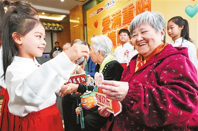 在河北区“爱满重阳 情暖桑榆”主题活动现场,辖区文艺工作者和宁园小学学生为建华养老院的老人们送去福袋、香囊。