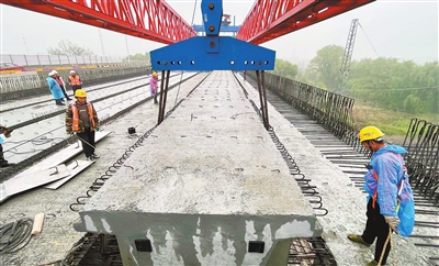 昨天,由中铁六局天津公司承建的天津普济河道立交桥维修工程完成全部梁体架设,为全线通车奠定了坚实基础。 记者 张磊 摄