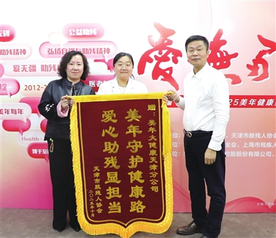 活动现场,天津市肢残人协会副主席李振环代表天津市肢残人协会,向美年健康集团天津公司赠送了写有“美年守护健康路 爱心助残显担当”的锦旗,感谢其长久以来对残疾人群体的真诚关爱和切实帮扶。