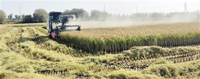 10月26日,种植户买图地·木萨站在田埂上,身边的稻谷堆成了小山,沁人心脾的稻香在空气中弥漫。作为试种300亩小站稻的种植大户,他在全面收割前特意选取了一块长势优良的地块先行采收,仅这一亩地便让他收获了约800公斤稻谷,产量和收入比往年能翻一倍多。望着远处收割机沿着田野外围一圈圈向内推进的景象,买图地·木萨的脸上满是笑容:“目前还没完成全部收割,但专家测产时说,小站稻比我们当地水稻每亩增收三成以上,现在看能达到!”