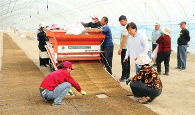农业专家王连芬(前排站立者)和种植户一起育秧。