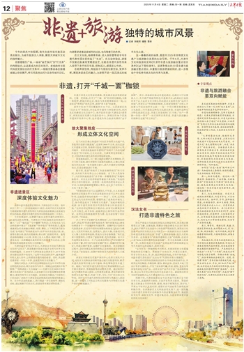 清单中的20个项目覆盖我市16个区。从滨海新区的“汉沽女书”体验馆、河东区的非遗传习体验新空间,到河北区的津派文化交流中心、南开区的非遗(天津皇会)进景区,再到东丽区的群众非遗体验中心、津南区的56个民族非遗保护传承中心等,让非遗成为助力旅游发展的“金字招牌”。其中,滨海新区推动非遗进酒店,在酒店大厅设置面人王、太平葫芦烙画等特色非遗展示点;武清区打造国内首个以大运河文化为核心的沉浸式文旅综合体“运河不夜城”;西青区以“传承精武精神,弘扬家国情怀”为核心开发霍元甲纪念馆研学之旅……每一个项目都承载着地方文化基因。当非遗技艺转化为沉浸式体验、非遗作品转化为特色旅游纪念品、非遗工坊变成热门打卡地,“生产—展销—体验—研学”一站式闭环自然形成,非遗与旅游融合的新路径也就“呼之欲出”。