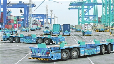 1.智能水平运输机器人行驶在天津港第二集装箱码头(2025年6月19日摄)。