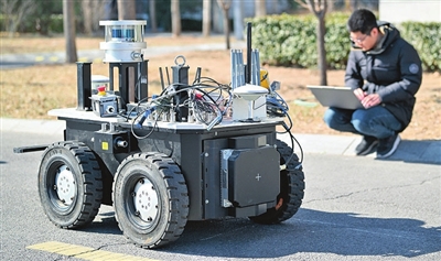 5.工程师在京津中关村科技城道路上对一款防爆轮式巡检机器人进行路测调试(2025年2月20日摄)。