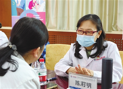 陈莉明(右)在接受患者咨询。 照片由受访单位提供