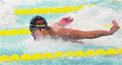 来到十五运会的赛场,王长浩一直在努力调动自己的竞技状态。昨晚比赛前的热身环节,他也是最后一个离开泳池的运动员。“赛前热身还是希望多做一些模拟,把速度冲起来,把状态调动得更积极一点。”预赛和半决赛均以头名身份晋级的王长浩在男子50米蝶泳决赛中位于第四道出发,从入水便一路领先,最终以23秒30夺得首枚全运会男子50米蝶泳项目的金牌,距离他自己保持的全国纪录仅差0.05秒。“拿到这枚很有意义的金牌非常激动,这也是对自己这段时间训练的一份回报。其实从预赛到半决赛,再到决赛,自己都是希望能冲击全国纪录的,但最终和自己预想的还是差了一点。”王长浩赛后说,“这次比赛我感觉自己的状态比较好,游起来挺顺,但是可能调整出了点问题,没有游出更好的成绩。”