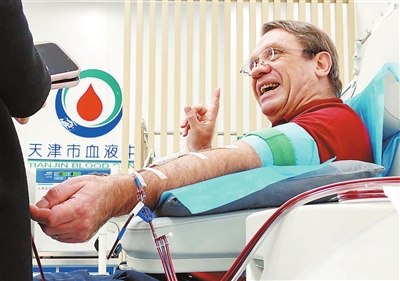 老皮在中国献血的渊源,还要从2008年说起。那一年,一次偶然机会,他在天津站前广场上看到有关无偿献血的中英文宣传,当时便留了心。几天后,他又在天津图书大厦附近看到献血车,与工作人员确认可以献血后,立刻撸起袖子,献了400毫升全血,正式开启他在天津的无偿献血之路。