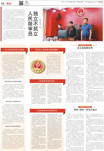 人民陪审员是具有中国特色司法审判制度的存在。他们独立于诉讼当事人、公检法机关、律师等法律专业群体。法院审理案件时,他们坐在审判席上,是合议庭组成人员。相比法官的法袍、律师的律师袍,他们穿着寻常服装,看起来更像当事人,而胸前的徽章又让他们显得格外庄严和神圣。他们参与合议庭评议,可能只是说了一个理儿,却恰恰体现了“大众正义观”。