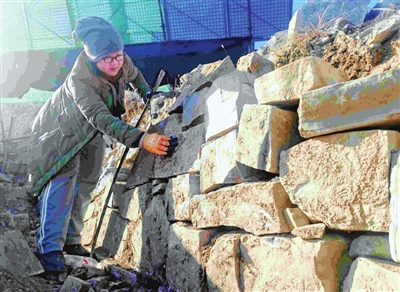 在石材使用上,团队坚守“零外购”原则:所有补砌用料均来自周边散落的坍塌构件,收集后按大型块石、小型块石、条状拉结丁石分类堆放于坍塌区域周边,便于施工取用;对于收集的石材,只要无严重隐残、瑕疵,均不加工或仅轻微修整,表皮大型石材严禁切割为小块,最大限度保留原材风貌。“每一块石头都带着历史印记,我们要做的就是让它们‘回归原位’。”冯科锐与工人们约定,捡拾石材需在缓坡侧向下最多3到5米的位置,务必保障安全。