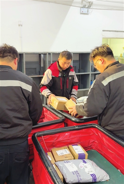 图为武照正(中)正在分拣快件。 蒋赛赛 摄