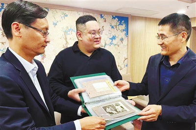 黄子潇(中)向周恩来邓颖超纪念馆工作人员捐赠照片。