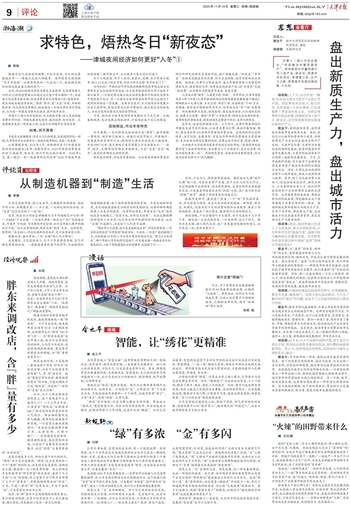 入冬未必要“猫冬”,入夜更不能“休眠”。今年年初,天津市商务局等4部门印发《天津市推动夜间经济持续健康发展的若干措施》,明确提出以天津之眼、古文化街、津湾广场、滨海新区“于响”片区、东疆港、国家海洋博物馆等为节点,培育标志性“河”“海”消费场景。同时强调串点成线、结线成面、商文旅体融合,以打造特色街区,拓展多元消费。围绕“冬季”二字做文章,持续突出品质和特色,更有特色的津城冬夜,将更好满足消费者个性化、差异化新需求。