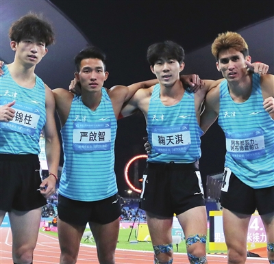 天津队昨晚在决赛第4道亮相,4棒选手依然是出战预赛的相同阵容,分别是严啟智、骆锦柱、阿布都瓦力·阿布德霍帕江、鞠天淇。这场男子4×400米接力决赛的竞争足够激烈又充满了意外,东道主广东队第2棒出现意外掉棒,而在第3棒的比拼中,先是四川队与河北队发生碰撞,随后安徽队的选手又在努力超越时意外摔倒……最终,四川队率先冲过终点,江苏队、浙江队紧随其后,天津队的鞠天淇第4个撞线。不过,比赛结束后,官方成绩迟迟没有发布,原来比赛中出现意外的几支参赛队纷纷提出申诉。记者们只能随时关注申诉结果和颁奖仪式的安排。起初裁判组提出重赛,但经过商议又取消了重赛的决定,确定将通过研判参赛队伍的申诉请求,排定最终的比赛名次。截至今天凌晨,男子4×400米接力项目的颁奖仪式依旧没有举行,只能等待官方通报,才可以给出该项目最终的名次结果。