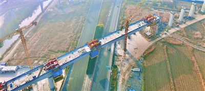 近日,京滨城际铁路滨海特大桥跨秦滨绕城高速连续梁顺利合龙。滨海特大桥横跨滨海新区与东丽区,全长14.597公里。京滨城际铁路全线通车后,滨海新区至北京城市副中心将快速通达。 记者 张磊 摄