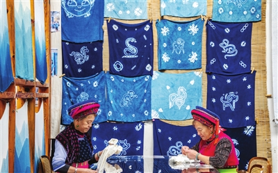 白族扎染以板蓝根为主要染料,工序包含绘图、制版、印花、扎花、染色、漂洗、拆花、晾晒等。其中,扎花、浸染为核心步骤,手工艺人执针走线,在布料上扎出不同类型的图案,再用植物染料染出蓝底白花、生灵百态。2006年,白族扎染被列入第一批国家级非物质文化遗产名录。 新华社发