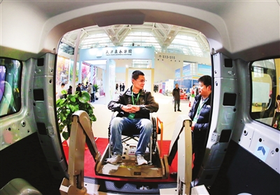 工作人员展示纯电动福祉车全液压升降移动装置。 记者 张立 摄