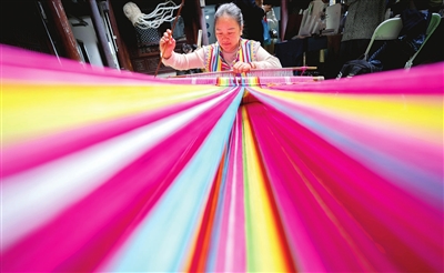 独龙毯制作技艺展台的工作人员在2025非遗品牌推广周上制作独龙毯。 新华社发