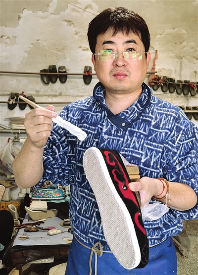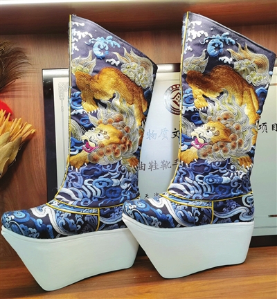 从那以后,赵凤彬沉下心来,与父亲一起研究戏曲鞋靴制作,将现代审美融入鞋靴纹样设计,并改进鞋靴制作工艺。赵凤彬不断地努力创新,使鞋靴更加结实耐穿,不仅增加了鞋靴穿着的舒适度,也兼顾了外形的精美。2019年,赵凤彬创立了自己的品牌——“踏东来”戏曲鞋靴,将销售渠道扩展到了全国各地,产品深得广大戏曲爱好者的喜爱,也得到了专家的高度评价。在天津古文化街的“梨园阁”“晟艺阁”里,中外游客都能欣赏到这些精美的手工戏靴。“这就是文化传播。”赵凤彬说,“每卖出一双鞋,就多一个人了解这门手艺。”