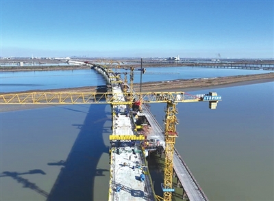 由中国铁建大桥局承建的津潍高铁天跨独流减河连续梁目前独流减河全桥正在进行逐跨合龙,全桥共18个合龙段,目前已完成10个合龙段,预计12月上旬完成全桥合拢。津潍高铁是“八纵八横”高铁骨架的重要组成部分,建成后将优化升级京沪以东地区综合交通运输走廊,进一步完善综合交通运输体系,在推进区域资源共享、实现区域协调发展、优化京沪铁路通道布局等方面发挥着重大作用。 李天玉 摄