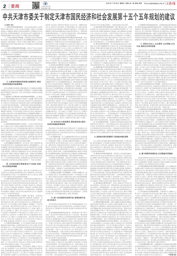中国共产党天津市第十二届委员会第七次全体会议认真贯彻落实党的二十届四中全会精神,结合天津实际,就制定天津市国民经济和社会发展第十五个五年规划提出以下建议。