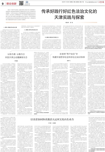 党的二十届四中全会提出,发展具有强大思想引领力、精神凝聚力、价值感召力、国际影响力的新时代中国特色社会主义文化,扎实推进文化强国建设。天津作为马克思主义早期传播的重镇,拥有深厚的红色法治文化资源。进入新时代,天津围绕落实“八五”普法规划“加强红色法治文化保护、宣传、传承”的要求,融合发展法治文化、红色文化、中华优秀传统文化,推动红色法治文化的创造性转化与创新性发展,形成了一条挖掘历史资源、构建制度保障、探索多元实践的“天津路径”。