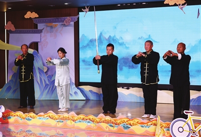 接着,周志国、郝连新等联袂献上功夫表演《武魂:气吞山河耀华章》,赢得喝彩。周志国展示了静海太祖门“苗刀”技艺。师承武术名家孙金生的周志国介绍:“太祖门的传人于1926年在静海镇创办‘静海国术馆’,当时影响深远,各地学习者慕名而来,始终以师徒模式传承。”郝连新则展示了天津市级非物质文化遗产代表性项目翻子拳(台头翻子拳)。今年63岁的郝连新介绍:“台头翻子拳的传承始于民国初期——当时翻子拳名家‘赛时迁’张澜被聘请到台头镇传授技艺,至今已传承五代。我从9岁就开始练拳,已练了50多年。”