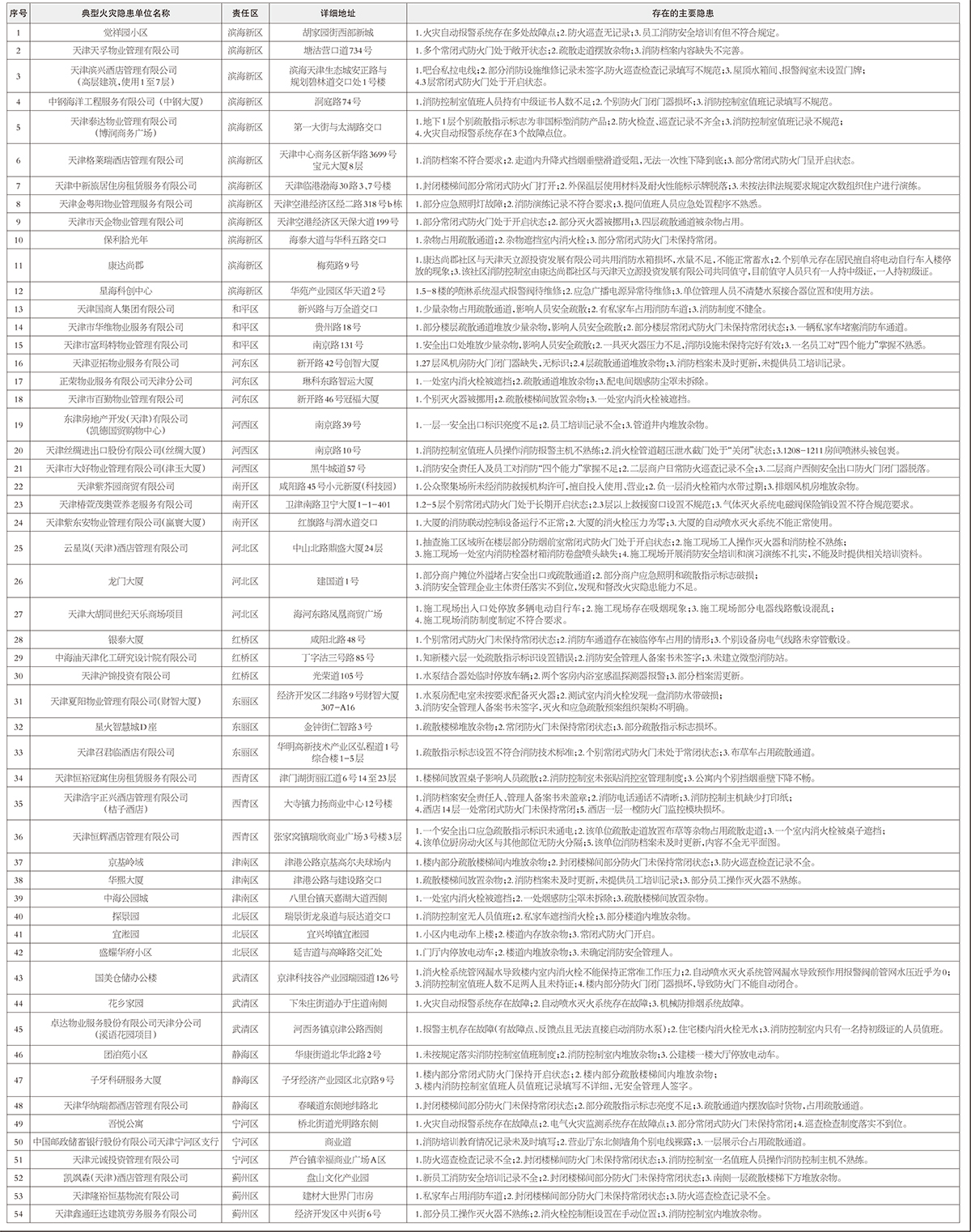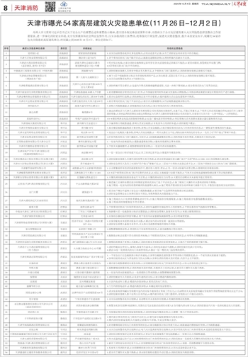 为深入学习贯彻习近平总书记关于安全生产的重要论述和重要指示精神,落实国务院安委会部署和市委、市政府关于全市高层建筑重大火灾风险隐患排查整治工作部署要求,进一步净化消防安全环境,充分发挥媒体和社会舆论监督作用,压实各级消防主体责任,统筹强化日常监管,促进火灾隐患整改,提升本质安全水平,现曝光54家存在火灾隐患的高层建筑单位,时间截止到2025年12月2日。单位名称如下: