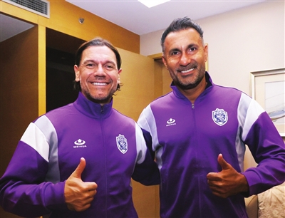 2025中国传承足球明星联赛开赛在即,今天中午,天津老甲A队将进行出征前的最后一次训练。前天深夜和昨天凌晨,两名新加盟的外援桑托斯(右图右)、何塞先后抵达天津,今天的训练,球队凑齐了在天津出发的所有教练、球员。