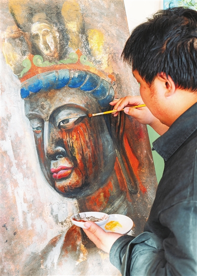 如今,经过“出得深山,入得画室”这么一番“折腾”,那个曾经的想法活生生地转化为三幅可触可感的作品——独乐寺的《哼哈二将》《明王》及《十一面观音》。它们均被他用蓟州的颜料亲手临摹再现。