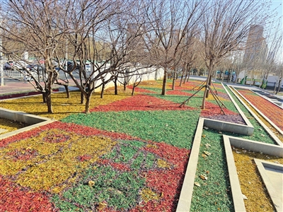武清区城市管理委园林绿化中心工作人员告诉记者,草本花卉灵活多变,不同的草花组合可以营造出不同的氛围。在天津,草本花卉最迟在10月底就开败了。为此,区园林绿化中心在10月至11月期间进行了彩虹木屑制作及铺装作业,用园林养护过程中修剪下来的树枝、树干,粉碎后筛选染色,制作成彩色木屑,铺盖到事先设计好图案的公园绿地中,让冬天的地表也有了缤纷的色彩。类似的景观铺装在武清区翠亨路、福源道等道路上,总计投放了50多吨彩虹木屑。