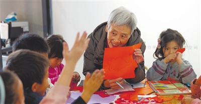 孙枫玲(右二)教孩子们撕纸。