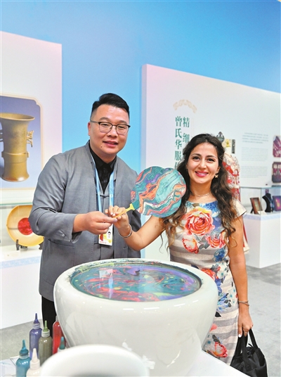 来自阿塞拜疆总统新闻处的萨尔维娜兹(右)对自己制作的漆扇爱不释手。左为“天津郑氏漆器制作技艺”团队带头人郑勇。