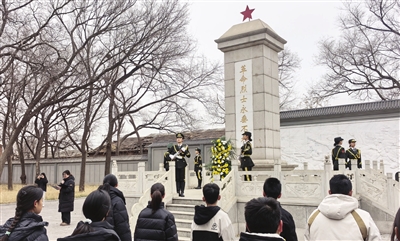 昨天,天津中医药大学和静海区杨成庄乡中学60余名师生来到静海区宫家屯爱国主义教育基地, 向革命先烈敬献花篮。 通讯员 李春晖 摄