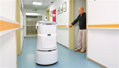 图为位于河北区的童心缘养老院内,机器人助手在院区巡查。