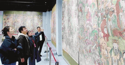 毗卢寺坐落于石家庄市北郊,是一座拥有千年历史的佛教古刹。寺内壁画题材丰富,融合多元文化的人物与故事,被誉为“明代民间绘画艺术巅峰之作”,与甘肃敦煌莫高窟壁画、山西永乐宫壁画、北京法海寺壁画并称“中国古代四大壁画”。现场展出的五组壁画作品构图繁复而层次分明,线条遒劲、色彩绚丽,形神兼备、呼之欲出。