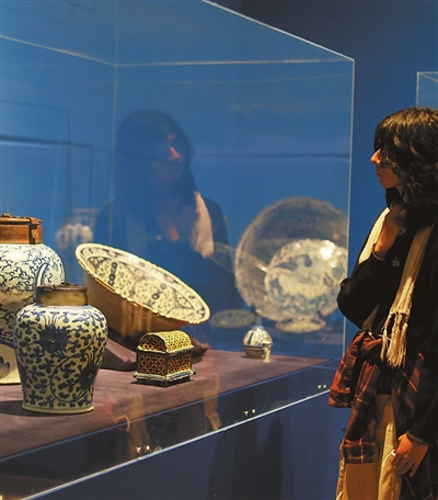 当地时间12月17日,在墨西哥首都墨西哥城举行的马尼拉大帆船主题展上,一名女子观看墨西哥当地陶器和中国明清时期瓷器。