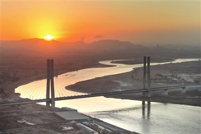 晨曦初绽,金色朝霞映照包银高铁乌海黄河特大桥,钢铁巨龙静卧母亲河之上。当日,包银高铁全线贯通运营。12月23日在日出时分拍摄的包银高铁乌海黄河特大桥。