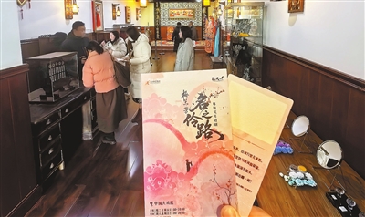 戴上智能耳机,拿好集章折页,走进主楼与副楼之间的小巷,耳机里即刻传来津韵十足的天津时调以及各种吆喝、交谈声,加之眼前民国范儿十足的装潢,仿佛让人一下子回到了1936年的天津。此时,观众也开始陪伴戏曲大师梅兰芳,开启一段喜怒哀乐的传奇旅程:“科班”里,头面饰品精美别致,听师父说着讲究与规矩,大家还可以在现场拿起马鞭学上一段表演;在剧院大厅,人们一同感叹现代化剧场的辉煌;咖啡厅里,观众从梅兰芳的无奈中感受他的温暖善良;电影放映机前,他又向大家吐露着让戏曲走向更远的心声……