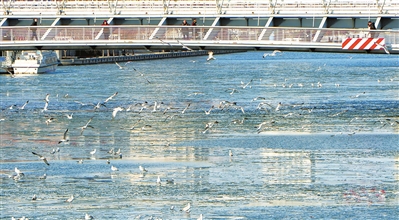 近日,我市海河逐渐冰封,成群海鸥聚集在刘庄桥附近。 记者 周伟 摄