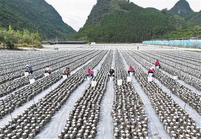 图为广西河池市罗城仫佬族自治县东门镇大福村村民在采收黑木耳。