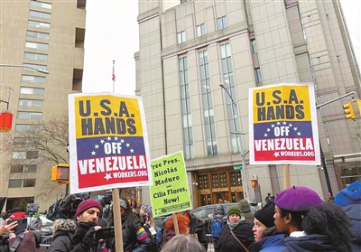 1月5日,在美国纽约,人们在马杜罗出庭的纽约南区联邦地区法院外抗议美国对委内瑞拉发动军事打击。 新华社发