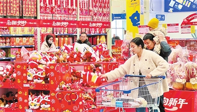 我市年货市场年味渐浓,各大超市马年生肖摆件、“福”字等装饰品已上架,吸引市民选购。