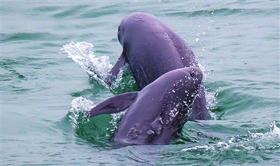 在湖北省宜昌市江边,长江江豚在水中嬉戏。