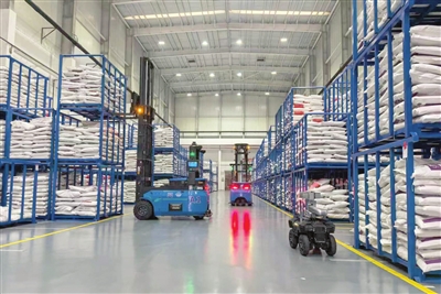 天津东疆外代物流有限公司堆场无人仓库中,无人驾驶叉车和智能巡检机器人进行货物码放和仓库巡查。