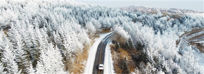 2026年1月5日在甘肃省定西市通渭县华家岭镇拍摄的雾凇景观(无人机照片)。