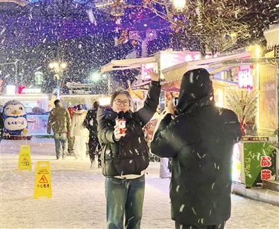 ① 降雪装点意式风情区冬夜。 记者 孙立伟 摄