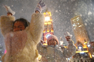 ② 两个小姑娘在五大道公园钟楼前玩雪。 记者 胡凌云 摄