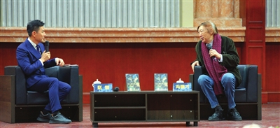 昨日,《清流:五大道生活(1942—1966)》新书分享对谈活动在天津音乐厅举办。图为冯骥才(右)与文化学者赵普交流。