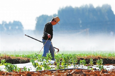 图为1月20日,在云南省曲靖市陆良县芳华镇双合村,农民为小春马铃薯覆盖地膜。