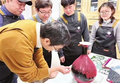 在天津工业大学近期举办的“中国传统髹饰技艺人才进修班”上,学员在创作作品。